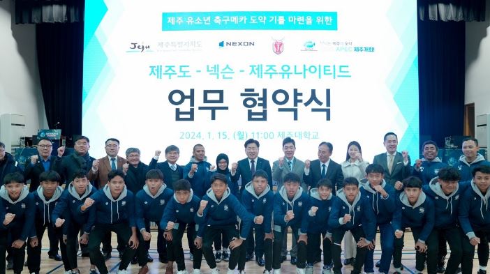 (제주=연합뉴스) 고성식 기자 = 제주도와 넥슨, 제주 유나이티드FC(이하 제주Utd)가 15일 제주대학교 체육관에서 청소년 축구대회 육성을 위한 업무협약을 체결했다.